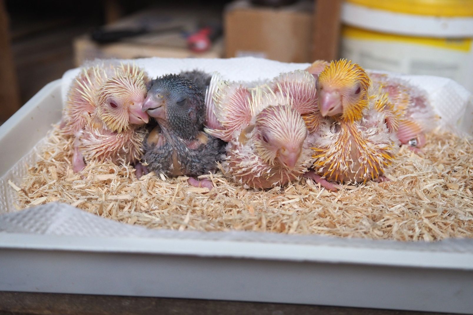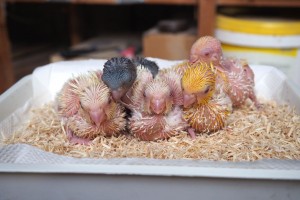 挿し餌中の サザナミインコ、 ケージ c – 12 の ヒナ 4羽 + 1羽。