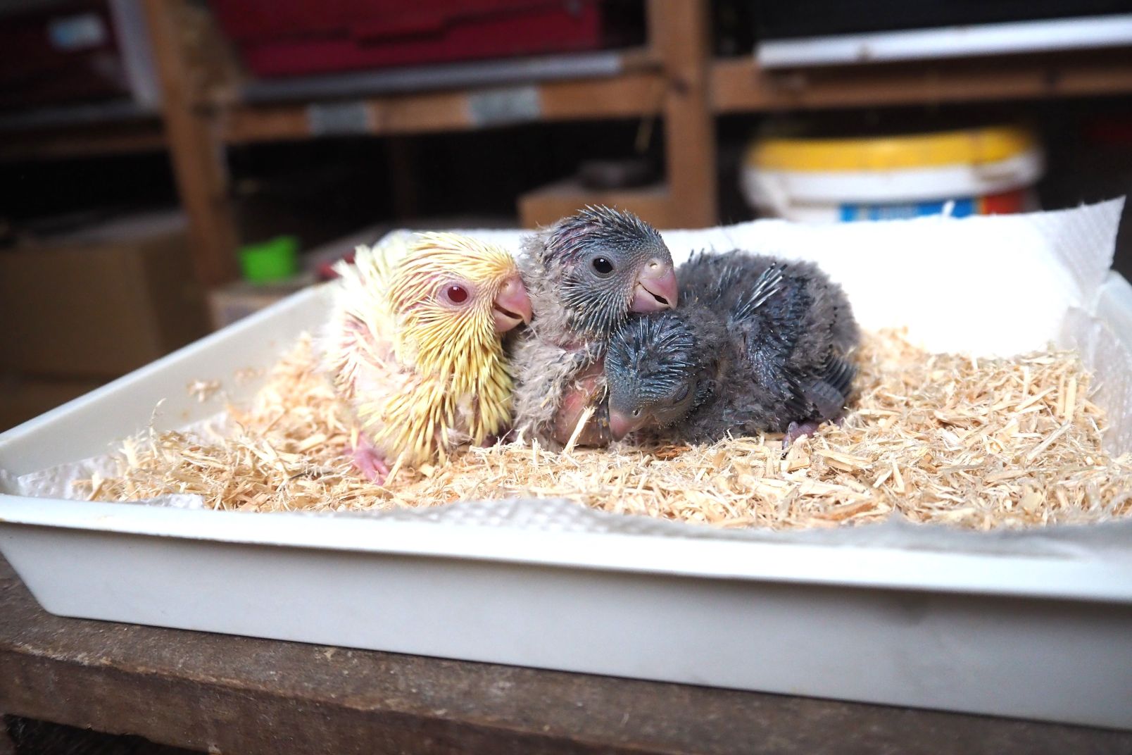 挿し餌中の サザナミインコ ひな。 3羽は 全て 異血 です。 (画像クリック → 拡大に)